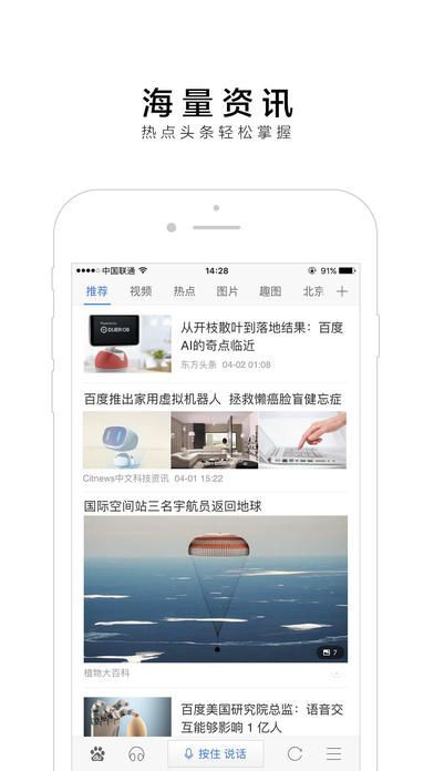 手机百度日活过亿,是国内活跃用户TOP3的APP,依托百度家族深耕多年的独有资源及强大技术优势,改变传统人“搜索”资讯的模式,海量新闻热点头条为您个性推荐,智能算法一触即达,让您的生活简单高效。