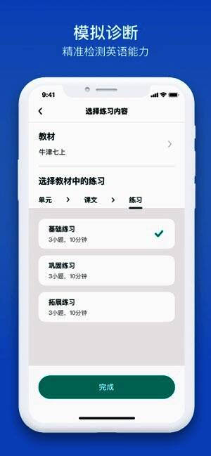 支持背单词、备考训练、绘本、口语等成绩统计。