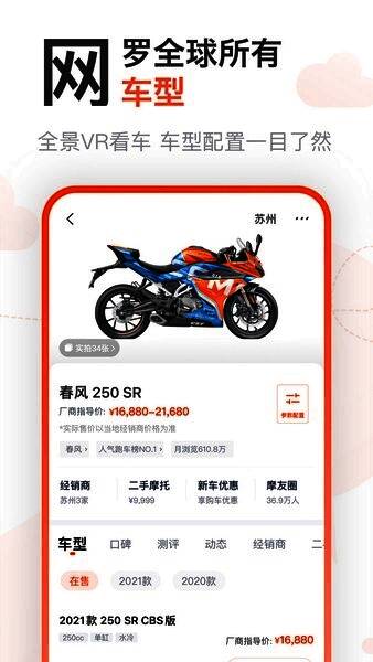对于有购车需求的用户来说,摩托范同样提供了便捷的二手车交易平台。进入APP后,点击“二手车”模块,便能看到海量真实可靠的二手摩托车资源。