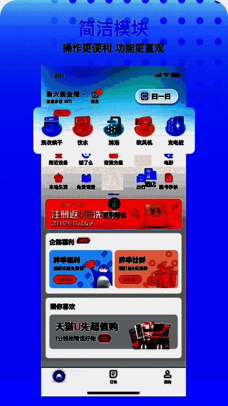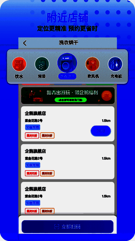 例如点击“附近设备”功能,即可进入设备查找界面;选择“洗衣烘干”功能后,系统将自动为您匹配最近的可用设备。