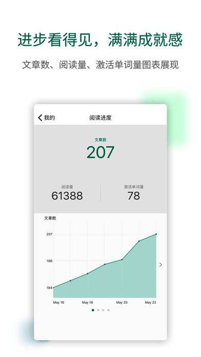 4、你每天的学习进度,包括完成的文章数,被激活的单词数(即学过的单词有多少出现在文中),都会通过图表生动展示。