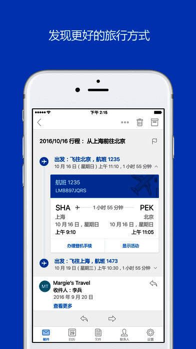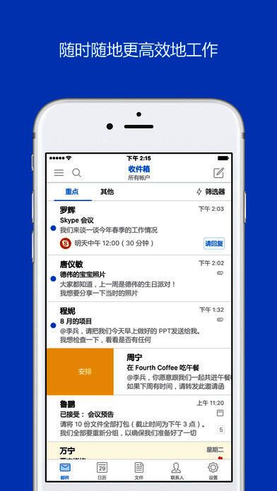 想要先查看最重要的邮件就到“重点”收件箱,该收件箱将重要邮件放在最上方。点击几下就可以在电子邮件和日历之间进行切换,方便你安排下一个会议或共享你的空闲时间。你也可以从文件列表中选择一个文档,再将其无缝附加到电子邮件中。