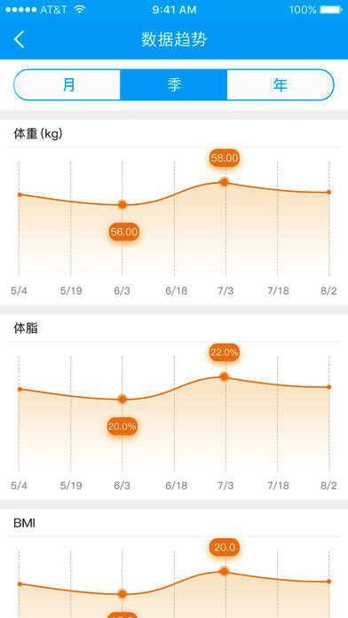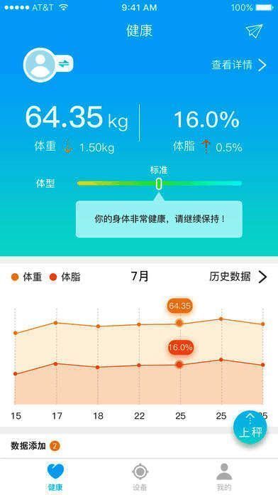 4、实时同步你每次测量的体重、体脂数据,生成身体成分变化曲线,直观的呈现每一次测量的数据趋势,对于身体的微小变化都了如指掌,监测实际测量值与设定目标值的差距,为自己的目标所奋斗,实时同步你每次测量的收缩压、舒张压和心率数据,生成数据趋势图,随时监控你的血压健康。