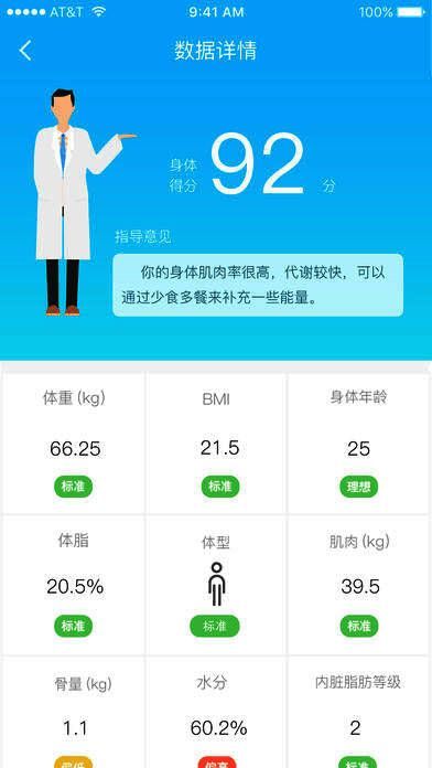1、提供体重、体脂、BMI、水分、蛋白质等12项全身数据,及脂肪率、肌肉量等10项局部数据,统计、分析、评测身体状态,并且提供合理化的饮食、锻炼建议,以及身体得分排名提供收缩压、舒张压和心率数据,并且提供权威的指导意见以及国际标准对照表。