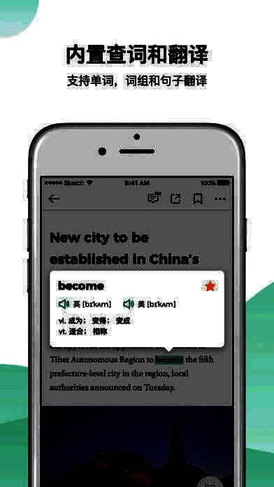 3、新单词?没关系!e读内置查词功能,轻轻一点,释义立现。 还可以选择自己难度水平的文章,让英文阅读轻松愉快。