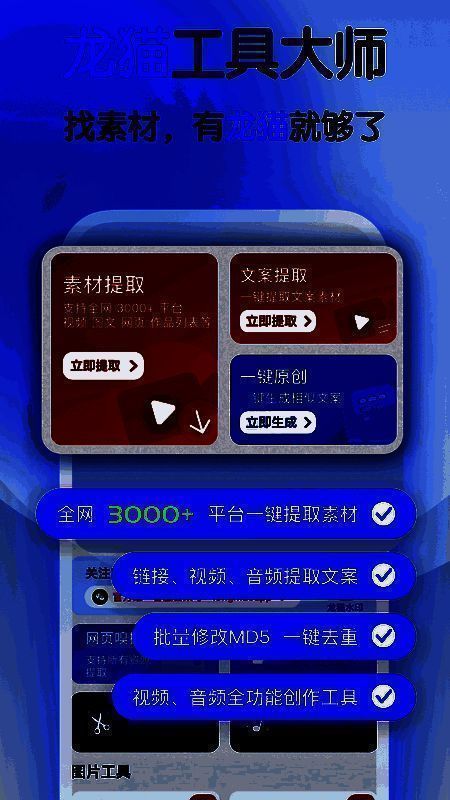 《龙猫工具大师》不仅具备全网超过3000个平台的素材提取能力,还支持本地视频及音频文件的复制传输。通过批量修改MD5值,有效避免内容重复问题。其视频制作模块功能齐全,操作简便,即使是新手也能快速上手。此外,图像对比度增强功能结合人工精修服务,为老照片修复带来更高品质的结果。