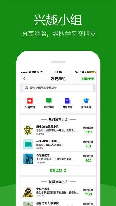 4、【兴趣群聊】这里有诸多爱好英语的男神女神、配音达人,时刻关注ta的最新动态,及时聊天,发现你的兴趣圈子!同时,将你的配音作品分享到朋友圈,接受膜拜;