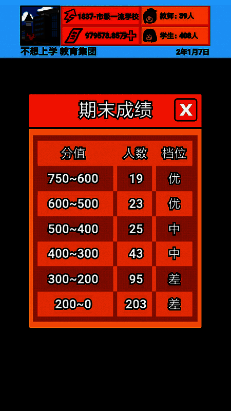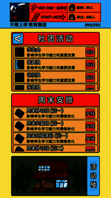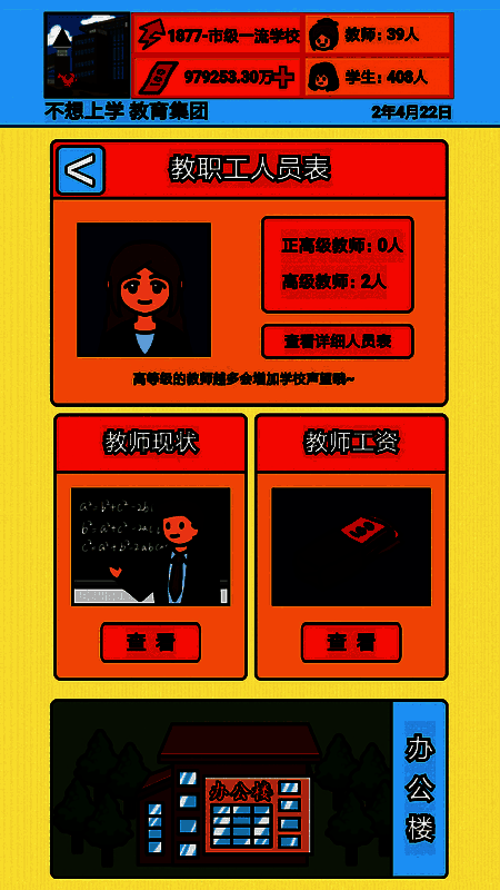 《校长模拟器》一款好玩的模拟校长游戏,你当上了这所学校的校长,学校要把一切都管好,然后不管是学生还是教职员工的情况,你都需要控制,学生的成长,老师的考核,班级的安排等等,都需要你有一个全面的计划,同时在此期间,可以通过配套相应的建设项目吸引学生报名,通过增加学校的师资力量,建设世界名校,你也赶紧去试试吧。