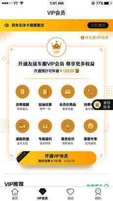 【全新友途VIP会员功能】友途VIP会员享受加油优惠、违章代办等九大会员权益,会员身份标识,尽显尊贵;更有VIP商城,VIP会员专享低价,优质用车生活,只为您甄选;
