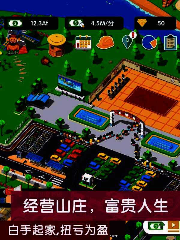 一款休闲的模拟经营游戏,玩家可以在游戏中当老板打造一个田园诗般的休闲度假胜地,而且在游戏中,您将开发和管理别墅,不仅要完善别墅的娱乐设施,让游客体验休闲垂钓、自助烧烤、健康spa等休闲娱乐项目,还要努力发布广告吸引游客,建设停车位,提高区域服务效率。