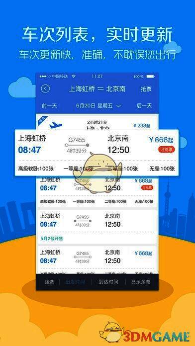 高铁票务app所有票源均来自官方,实时更新票源信息,购票、抢票快人一步。
