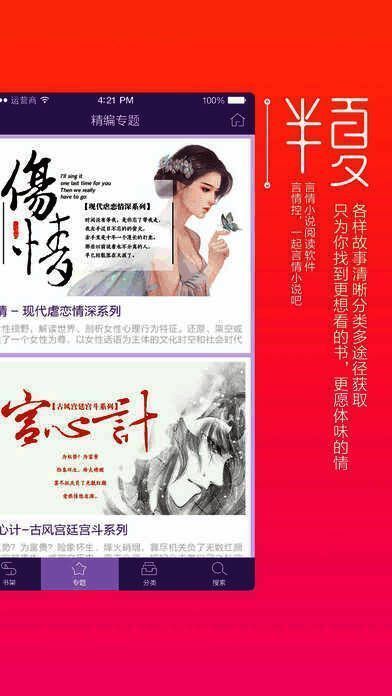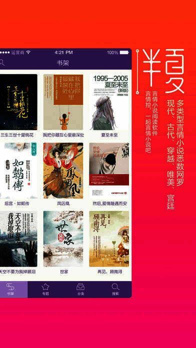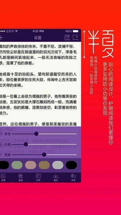 《半夏阅读》是一款类型丰富的小说阅读软件,在这里,拥有多款类型的言情小说供你阅读,包含了现代,古代,穿越等多题材小说。喜欢网络言情小说的小伙伴快来下载尽情阅读吧!