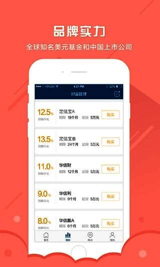 华夏信财app是一款金融理财应用,能够为用户提供优质的理财产品,做到稳健投资,可以让你的钱短时间内生出更多的钱。如果你是第一次注册这款应用的话可以得到新人专享大礼包,丰厚的礼品等你来拿。重要的是,这里的理财产品具备多样化的特点,每种产品不尽相同,每个人可以按照自己的经济实况与理财愿望自行选择合适的、满足的产品,随即就能线上办理投资理财,能够及时抓住重要的商机,非常的实用,而且用户在这里可以实现自由的理财生活,不仅能自选产品,还能自选期限与投入资金,超低的理财门槛能够满足普通大众的理财要求,是一款具备全民性的理财应用,赶快下载吧。