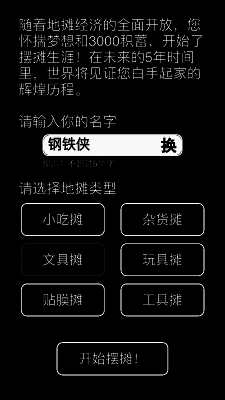 摆摊首富模拟器是一款用文字描述的一种全新游戏。在这里你将经营自己的店铺,持续经营,会有各种各样的业务问题需要你去处理,不断的赚取更多的收入,提高你的业务能力。