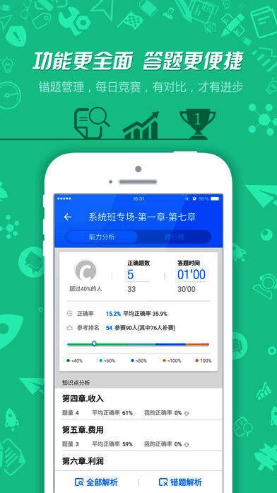 4、每天多场模拟考,千万网友同台竞赛PK,并带有正确率分析、答题排名数据、答题时间统计、开赛提醒等功能;
