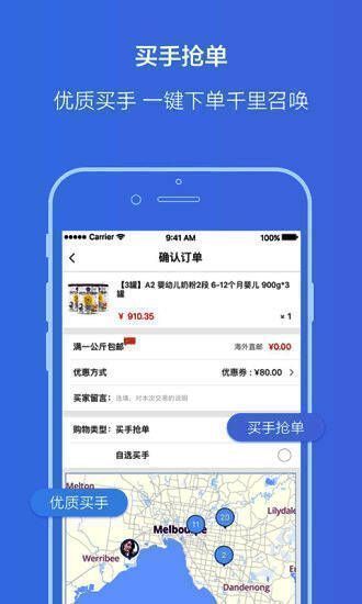 2、定位扫货:地图实时精确定位海外买手,买卖源头安心透明。两种购物模式,指定买手or一键抢单。一群海外帅哥美女买手,抢着帮你做代购的热情,隔着屏幕都能感受到!