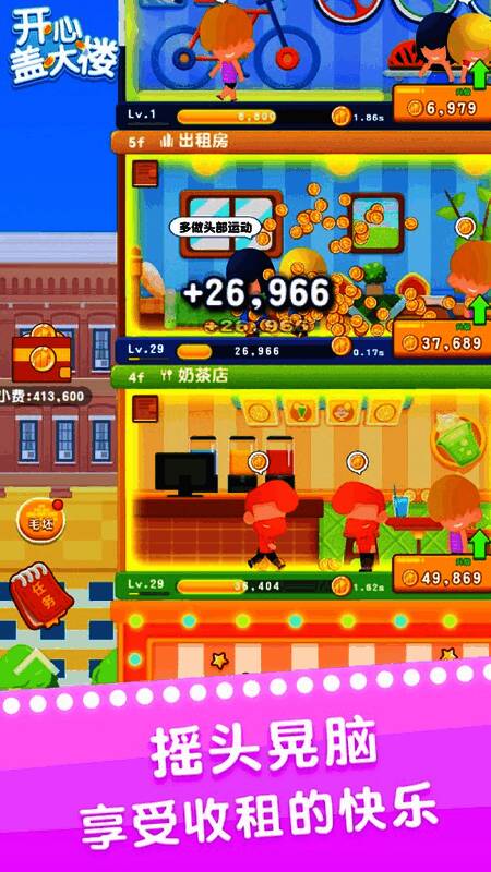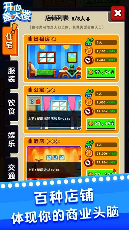 在游戏中,你可以建造精美的商店、豪华的房子、升级的仓库,轻松收获数百万金币,建造人们敬仰的摩天大楼,创造你的商业帝国!