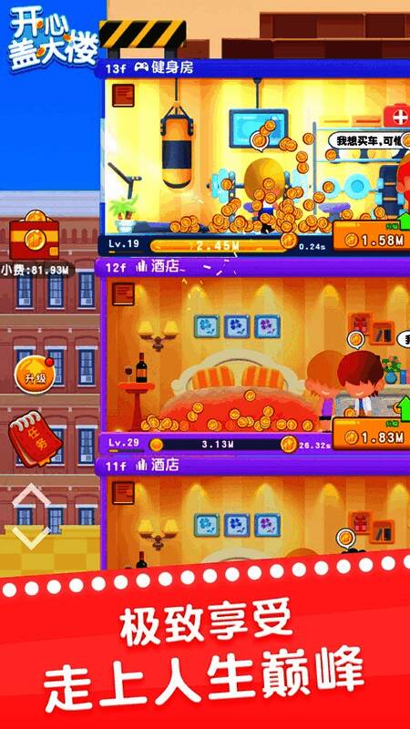 《开心盖大楼》是一款玩法十分有趣的冒险闯关手游!在这里我们的目的很简单,就是要不断的盖大楼,一幢幢高楼大厦等你来组建,这个过程还得要不断地进行装修,游戏内容很简单,只要成功把大楼盖的足够优秀就会有人来租你的楼层啦!