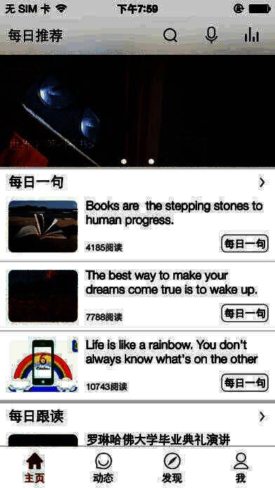 经典每日一句推荐,支持跟读和打分测试,支持语音和图片评论;