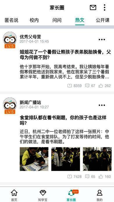 家长圈:家长圈热文推送,及时紧跟学校、地区新闻热事,更有匿名说功能畅所发言,沟通育儿烦恼;
