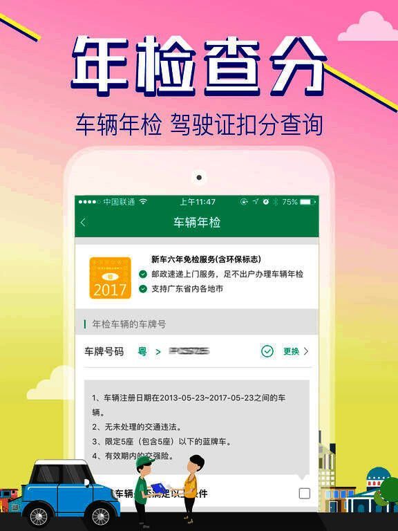 邮政速递上门为广东省车主提供新车六年年检服务,足不出户办理年检,快速、便捷地领取检验合格标志;