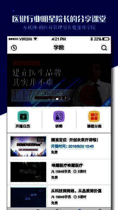 荟聚医疗行业一线前沿大咖讲师、明星院长们的视频课程,几百名网红讲师为您讲课,无论您是想深度学习,还是想在线取经,这所互联网+在线学院必将给让您不虚此行。