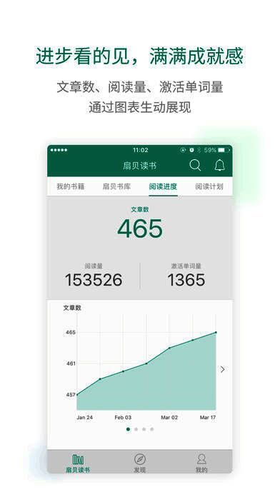 2、通过图表生动展示学习进度,包括完成文章数,被激活单词数。