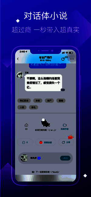 读小说就像看微信、QQ一样,点击手机屏幕就能弹出对话,还融入时下最流行的表情包,点击阅读就能弹出对话,读小说像聊天一样有趣根本停不下来!