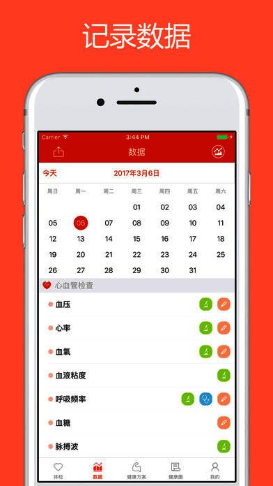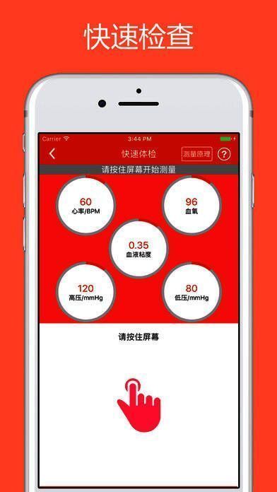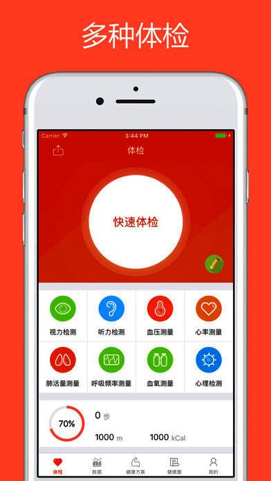 体检宝---手机测量血压、视力、心率。无需任何外设,体检宝直接用手机测量用户的血压、心率、视力、听力、肺活量、心理指数、色盲等身体数据,并提供有针对性的可交互的健康方案!