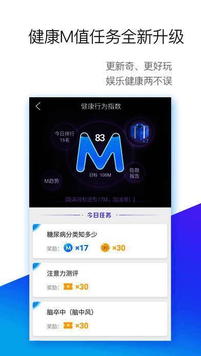 1、健康行为指数“M”值——国内首创以数值(星级)形式诠释健康行为的算法,实现全方位用户健康行为管理。让用户保持健康快乐的生活方式;