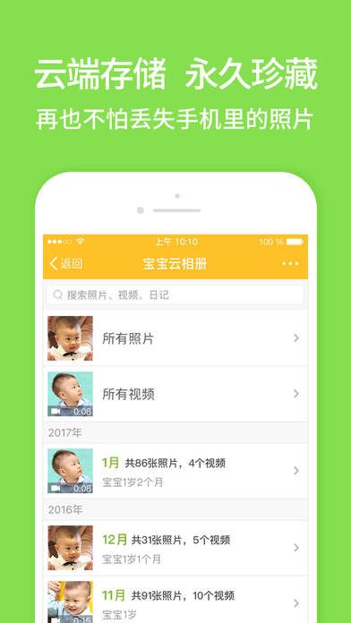 支持照片、视频、音频,满足你记录宝宝的各种所需;一人上传全家共享;家人专属空间,安全私密任性分享宝宝照片;上传后的宝宝照片、视频支持永久保存,再也不怕手机内存小;孕期提醒,孕妈日记,陪伴怀孕每一天;还有科学实用的育儿宝库,精选权威观点结合宝妈妙招,呵护宝宝成长。