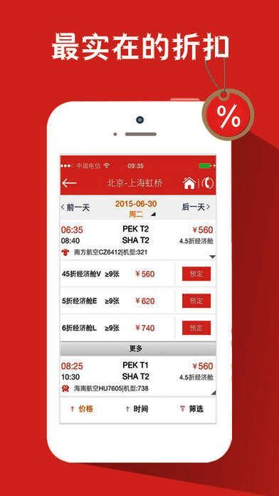 订机票提供机票查询与预定功能,可在线预订或电话预定,同时显示余票及多种排序筛选