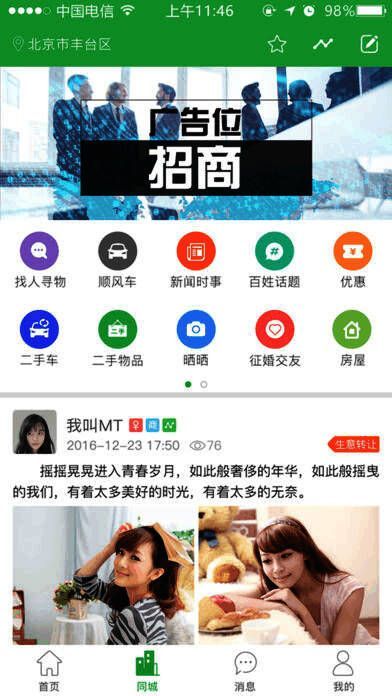 2、精心打造同城论坛,您可免费发布,订阅,同城新闻时事,百姓话题,二手信息,同城交友,房屋,招聘,求职,生意转让等信息。