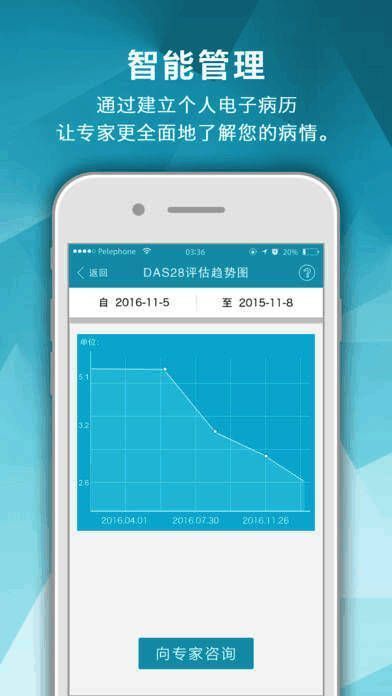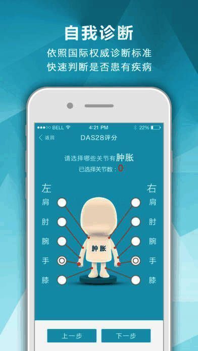 患者端包括自我评估(如疾病活动度评估DAS28、躯体功能评估HAQ)、用药管理、不良事件管理和实验室检查等主要组件,界面友好,操作简便;