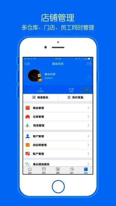 秦丝进销存是一款把生意装进手机里,随时随地管账、管货、管客户、管店铺的软件,本软件永久免费,手机、平板、电脑全平台支持,生意高效运转,彻底告别糊涂账,帮助商家采购进货,销售管理,仓库管理,库存管理,客户管理,商品管理,财务对账,经营分析等。
