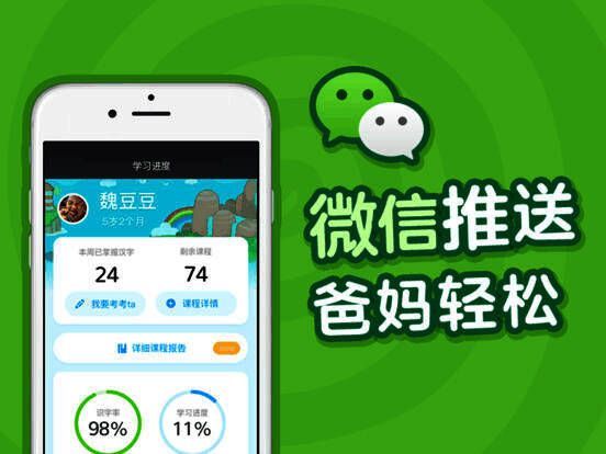 微信复习:通过微信推送孩子学习进度,并给出复习课程,让家长帮助孩子巩固。