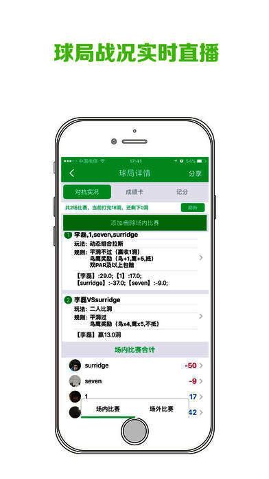 2、支持平时打球时各种娱乐游戏,包括二人比杆比洞、三人斗地主/抢洞、四人拉斯/抢洞等各种各样的娱乐游戏,只要记杆数所有得分自动计算,并可以在线即时直播、分享和围观,即使没有打球也可以分享打球的球友的快乐;