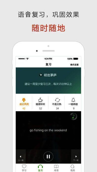 复习模块专门设有“模式设置”,用户可以根据自己的水平选择时间间隔进行跟读,提高听力理解速度和口语流利度。