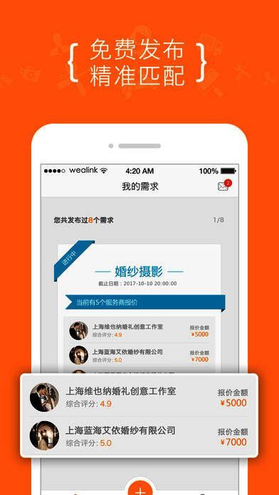 2、“8公里”是一款用户发布需求的专属软件。只需简单填写几个问题,”8公里”就能在短时间内匹配到周围合适的服务商,用户通过比价、对比服务质量等,挑选合适的服务商。