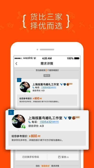 【货比三家,择优而选】:至多5位商家报价,用户衡量价格、服务评价等信息后,挑选合适的商家。