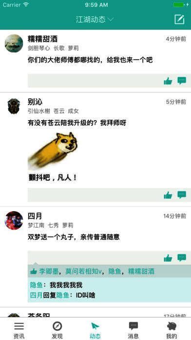 5、江湖动态,用户发布图文动态,分享自己的游戏经历及心情;