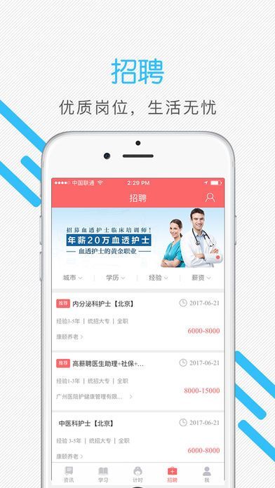 护士加APP是健康护航(北京)科技有限公司开发,针对护理群体提供专业护理信息资讯、职业规划、考试辅导等信息化移动服务平台。护士加客户端功能包括:专业又好玩的社区交流平台;专业培训,就业指导,考试培训,出国咨询等核心内容频道;护士加深切关注护士、护师和主管护师的执业环境,为广大护理相关人群提供移动化的交流互动社区。