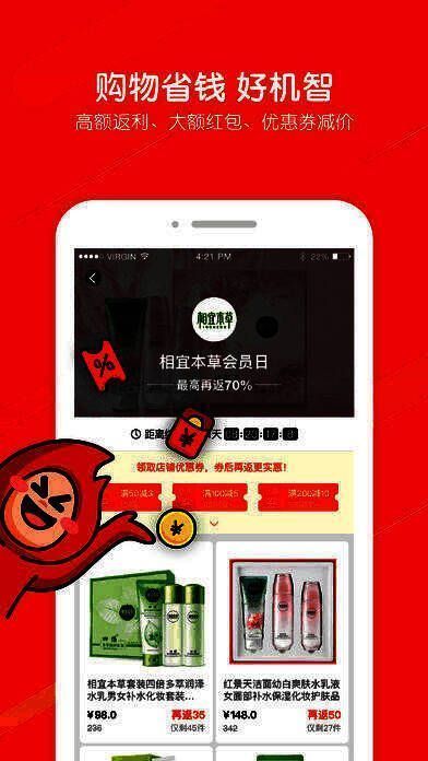 2、一淘购物可享大额现金红包,与优惠券叠加使用,省上加省,一省到底;
