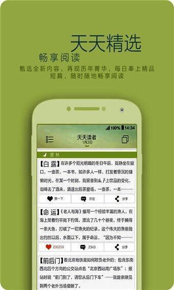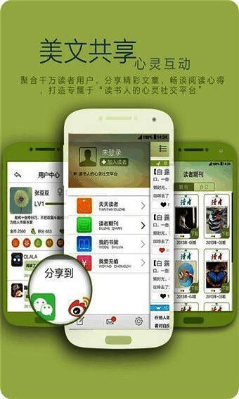 《读者(读者杂志官方版)》立志打造一个专属于“读书人的心灵社交平台”,借助移动互联网技术,聚合千万读者用户,于平台之内分享自己的读书心得,用阅读打通用户的朋友圈等社交通道,于平台之外与好友知己分享精彩书刊内容。