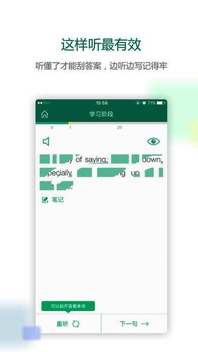 3、一遍听完不算完,所有之前没听懂的句子,都会要求你再反复听,直到你能一次听懂为止;