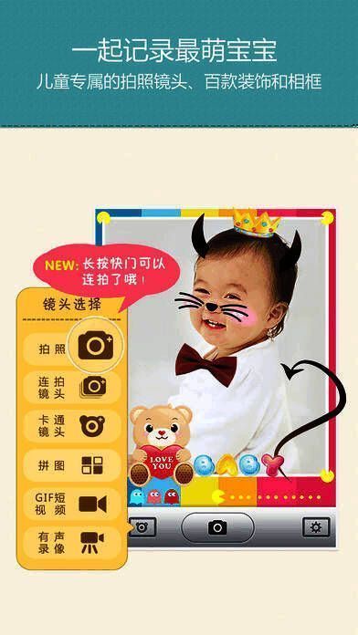 2、大头贴-卡通镜头各种造型有趣的大头贴,让宝宝成为可爱的卡通人物,让妈妈获得更多赞美;