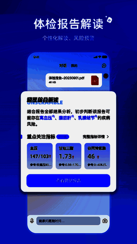 用户只需上传医学体检报告,讯飞晓医即可自动识别并逐项解读各项指标数值,给出通俗易懂的解释说明以及对应的健康建议。这种高效、直观的报告分析方式,帮助用户及时掌握自身健康状况,并做出科学合理的调整或就医决策。