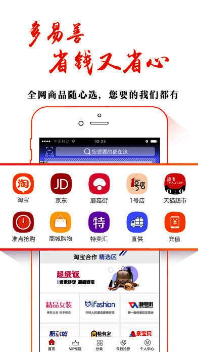 多易善手机app是全国规模、用户活跃度遥遥领先的综合性购物平台,囊括天猫、淘宝、京东、1号店、蘑菇街等各大商城精选商品并且价格更便宜、还提供线下服务,是网购达人公认的省钱神器,购物、售后全程无忧。