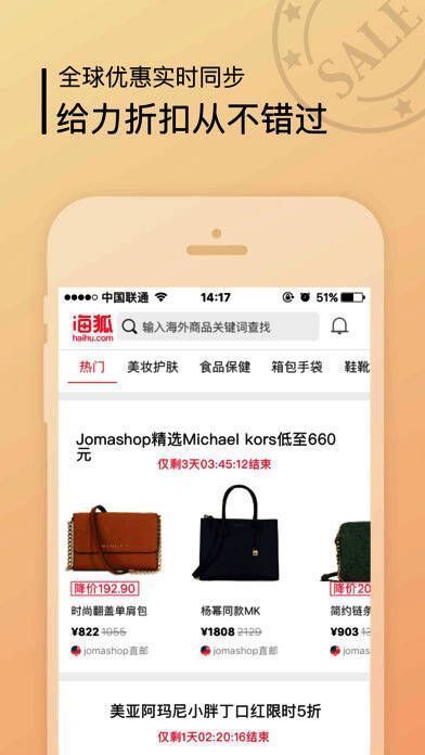 2、同步折扣:海狐海淘与海外官网无差价对接,甄选数万商家最HOT商品,同步官网价格、折扣、礼包等,享受海外震撼折扣;