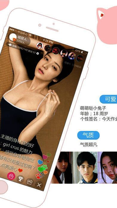 是一款全新的真人在线直播平台。这里汇聚了众多有颜值有才的美女直播,有在读校花、长腿模特、魅力主播、萌妹子、小鲜肉、草根偶像、奇葩怪才,各路型男靓女,总有一款适合你。24小时直播不间断,让你随时随地的观看,你还在等什么,快来下载体验吧!